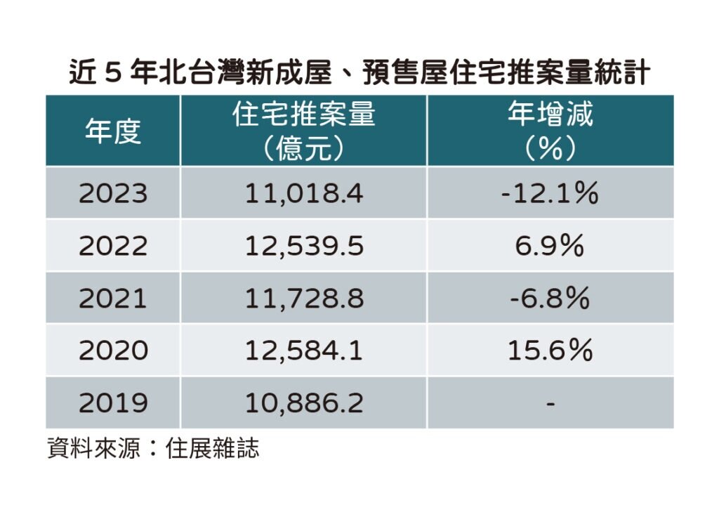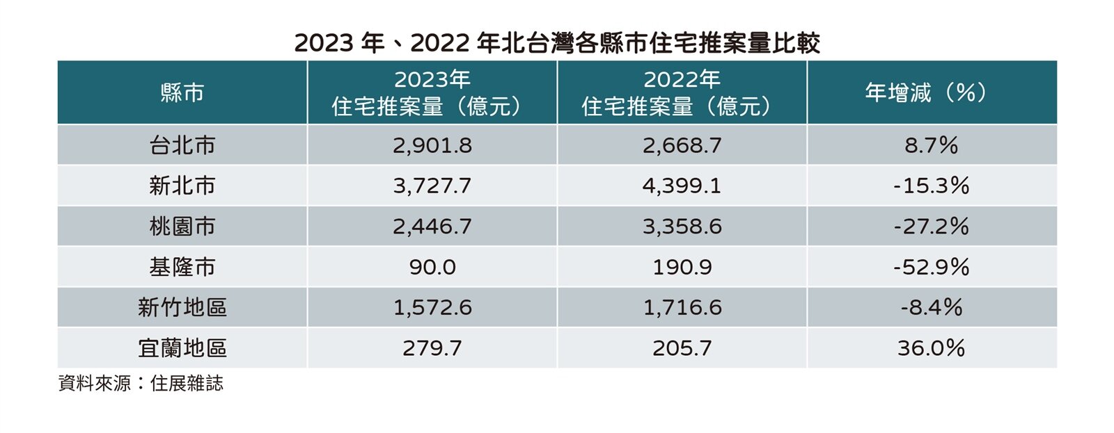 住展雜誌統計,2023年北台灣(北北基桃竹宜)新成屋、預售屋住宅推案量(不含商辦、廠辦建案)約1.1兆元,較2022年減少約1521.1億元,年減幅12.1%,也為2020年以來的4年新低。不過其中台北市與宜蘭地區仍現量增,各增8.7%、36%,其餘四區推案量下滑,並以基隆市年減52.9%,衰退幅度最大,其次為桃園市減幅27.2%。