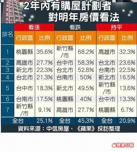中信房屋昨發表第4季「宅指數」,針對2年內想購屋的民眾調查,有45.3%的人看跌明年房價、看漲者僅25.1%,另有20.9%民眾認為明年房價持平、8.8%民眾沒有意見。對看跌民眾來說,最不看好的行政區為新竹縣市,有68.2%的民眾看跌,而看漲民眾中,則有35.6%的人看好桃園縣。