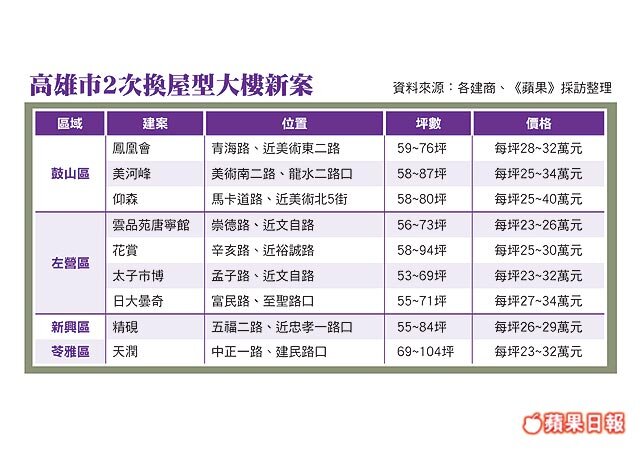如新案「太子市博」廚房皆配備L型廚具,鼓山區預售案「鳳凰會」更規劃全案每個房間都是套房,坪數59~76坪、4房,每坪28~32萬元。