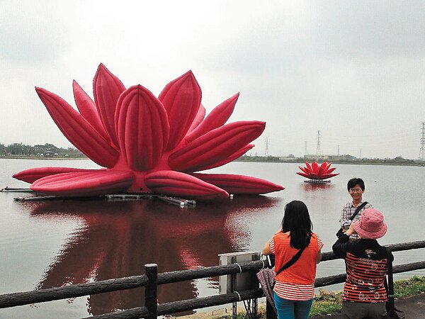 「沒有黃色小鴨,去看大紅蓮花也不錯」,韓國藝術家崔正化的「水上蓮花」在新屋鄉過嶺58號池(台66線快速道路與縣道114號交接處)展出,昨天吸引很多人觀賞,許多遊客驚喜表示:「水上蓮花隨風飄搖,會動、會呼吸喔。」
