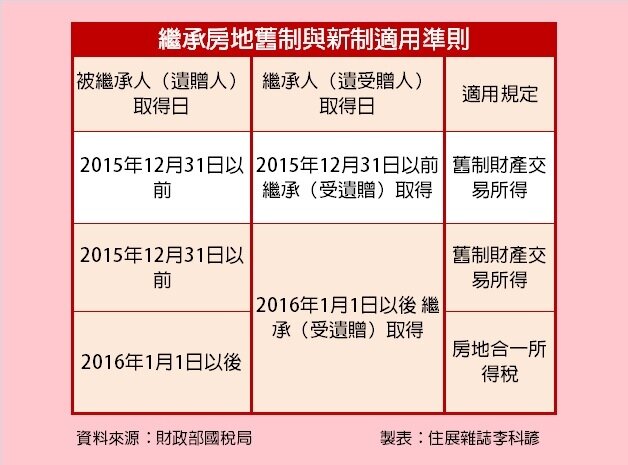 高雄國稅局指出,根據財政部2015年及2019年的公告,若個人繼承(或受遺贈)取得的房地,屬於2016年1月1日後繼承並且被繼承人於2015年12月31日以前已經取得該房地,則交易該房地時應適用舊制財產交易所得規定。但若該房屋符合所得稅法第4條之5第1項第1款規定的自住房屋條件,則繼承人可選擇申報房地合一所得稅。