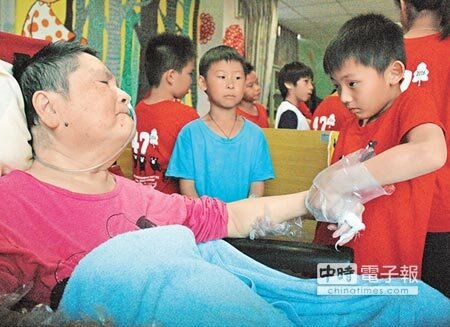 「爺爺,我是新南國小妤庭,幫您擦乳液囉!」高樹偏鄉小校新南國小長期接受各界愛心協助,6日20名學生擔任一日志工替創世院民擦乳液、量血壓回饋社會,並提早接觸公益教育。