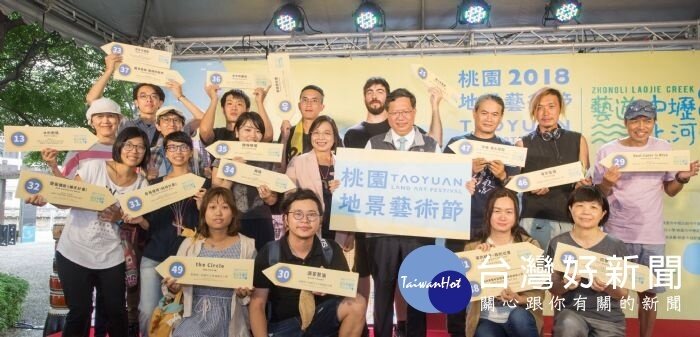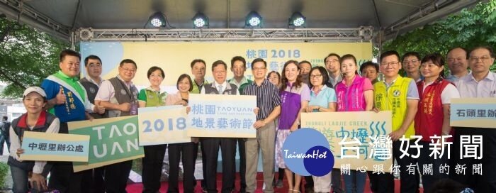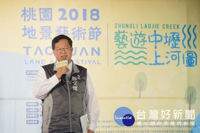 桃園市長鄭文燦12日下午前往中壢區,出席2018桃園地景藝術節「藝遊中壢上河圖」記者會,鄭市長表示,「2018桃園地景藝術節」共邀請42組藝術家,創作50件作品,包括3個展場,分別為楊梅富岡、中壢老街溪及老城區、青塘園,各有特色。富岡以鐵道藝術為主,重新活化富岡小鎮;青塘園舉辦水上劇場;中壢則結合市民參與,進行公共藝術與環境藝術,共有17組創作團隊結合市民、學生與社區,創作環保材質藝術品。期盼藉此讓老街溪的水文化產生更大的魅力,也讓大家認識中壢生活,實踐市民參與的公共藝術,讓藝術成為大家共同的語言。