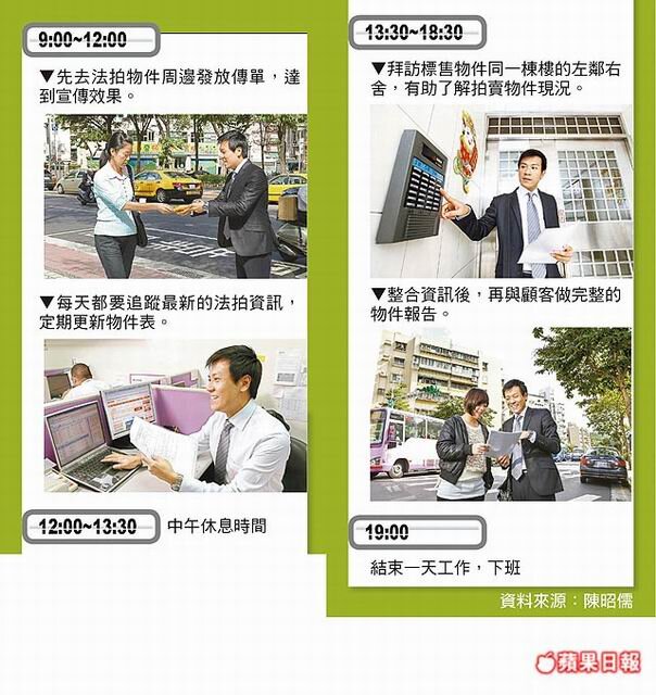 原在知名品牌汽車公司服務5年,陳昭儒毅然放棄穩定的收入,投身法拍代標市場。「以前工作穩定,但無法在短期內獲得豐厚的收入」因此轉換跑道從事業務性質工作。他說雖進入法拍代標行業,工時長、壓力大,但只要肯努力,收入將更可觀,因此,在此行業不但得增強自己對於房地產市場的了解,也能累積自己的身價。