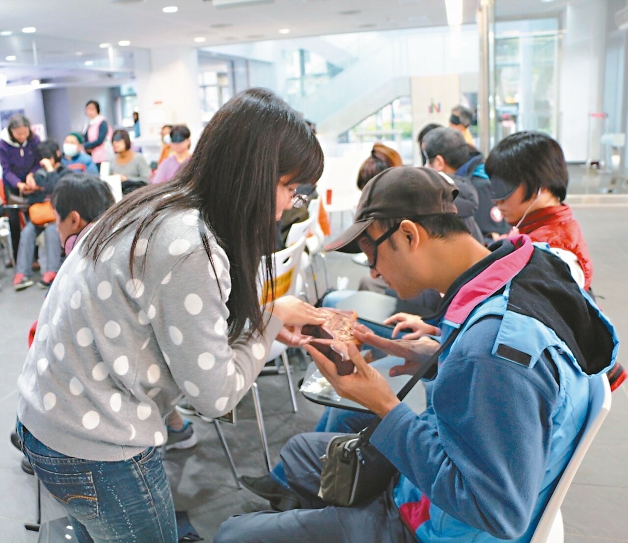 新北市立圖書館新總館昨天邀請10多名視障朋友,與20多民眾戴上眼罩,由旅遊達人吳成夫帶領進行一場別開生面的「蒙眼旅行」,透過聽、聞、觸摸與用嘴去品味,純粹用身體及以「心」去經驗一次沒有視覺的「4D輕旅行」。