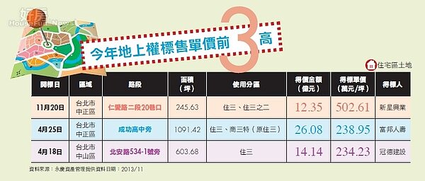 另外,近年來積極活化土地資產的中油公司,位於台北市承德路與龍江路土地設定地上權案,也都在今年順利標出;年底前還將有新竹大學路旁的土地設定地上權案、板橋前誠品倉庫土地設定地上權等案推出。