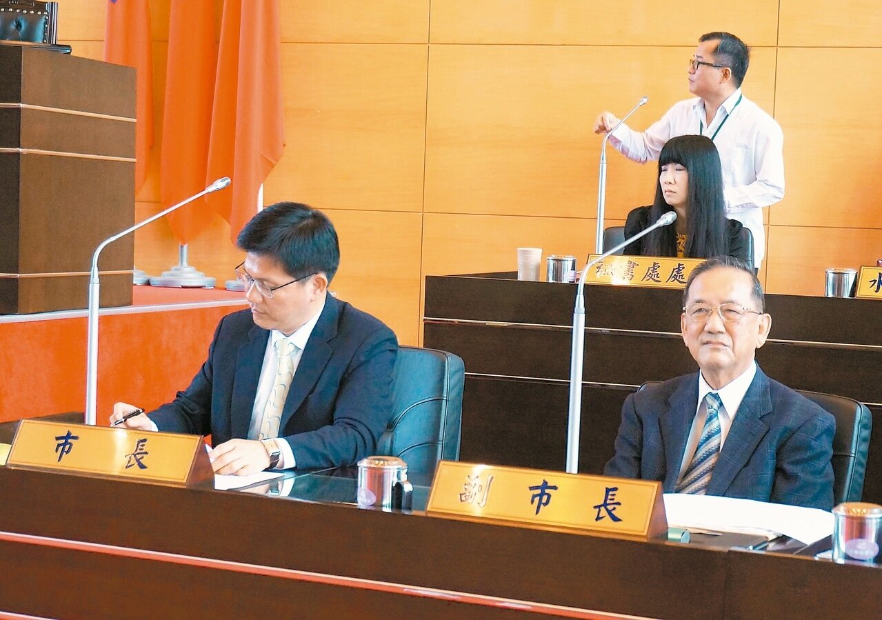 會中副市長林陵三被當成箭靶,市長林佳龍則表情嚴肅,低頭看資料。 記者洪敬浤/攝影