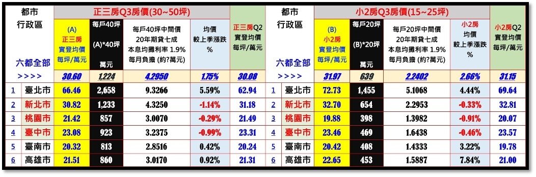 ▼Q3六都正三房及小2房房價。(圖/翻攝自台南市不動產估價師公會)