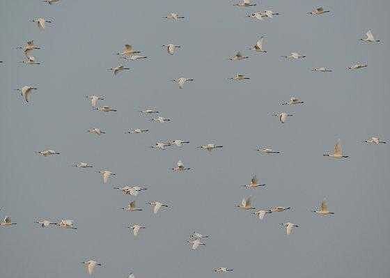 又到了來台度冬黑面琵鷺北返季節,台南市生態保育學會理事長邱仁武及解說員黃永豐等多人,15日,在學甲濕地生態園區發現原本棲息在園區內的黑面琵鷺開始北返,已有100多隻黑面琵鷺北返飛離台灣。