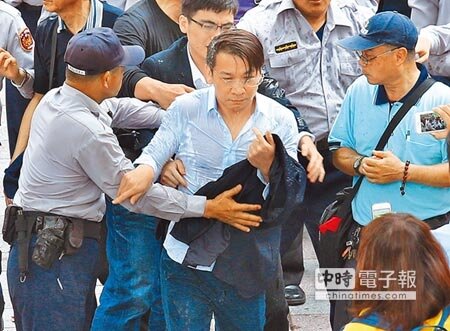 時代力量立委徐永明(中)遭抗議民眾潑水與衝撞,一臉狼狽。(姚志平攝)