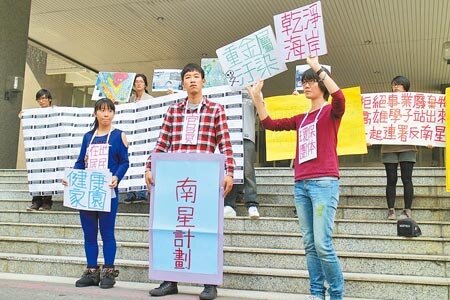 「還我乾淨家園!斷開南星汙染!」百名來自文藻外語大學、高雄師範大學等學生昨天連署要求高雄市府停止南星計畫開發。他們在市府前上演行動劇,痛批市府拿廢棄物填海造陸,完全不顧居民健康、環境汙染讓人心痛。