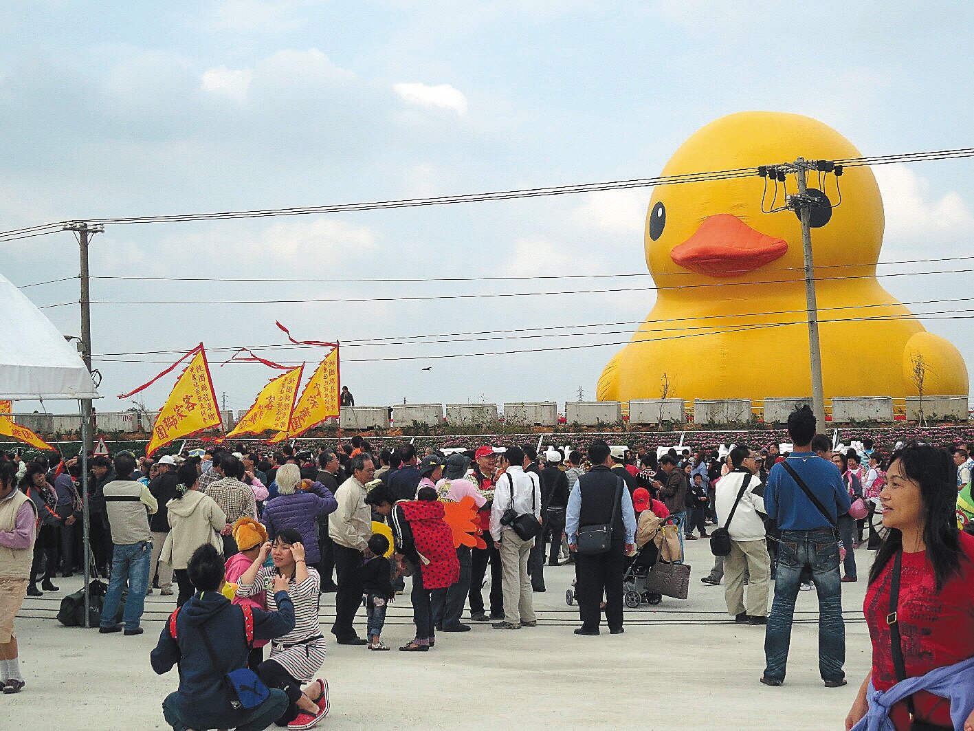 黃色小鴨到位,原訂26日開幕的桃園地景藝術節,昨天提早出現賞鴨人潮,新屋鄉市區街道人滿為患,小鴨所在的後湖塘攤販也提早開市。後湖塘的黃色小鴨亮相後,許多網友把大阪、香港、高雄等地的小鴨英姿對比新屋的黃色小鴨,網友嘲諷桃園縣政府不自量力,把小鴨帶到新屋,讓世人看到桃園辦活動的窘況。