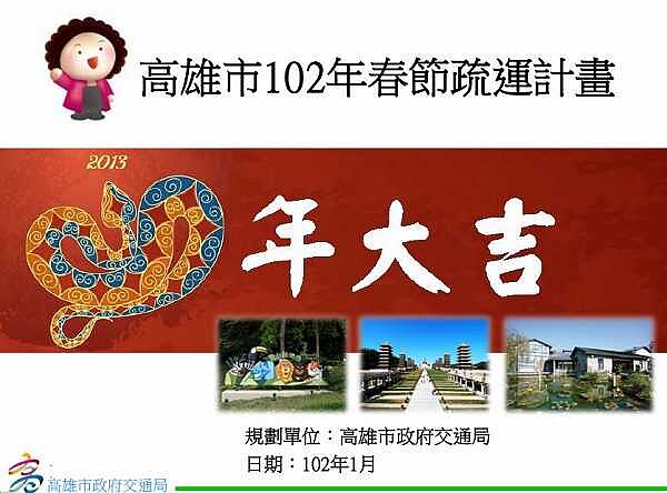 觀光景點部分,則針對壽山、西子灣、旗津、旗山、美濃、佛光山及義大世界等七大景點周邊實施交通管制,呼籲民眾多利用捷運、火車、公車、客運等大眾運輸工具,市府交通局智慧運輸中心也在即時交通資訊網規劃「春節交通資訊專區」,春節假期出門前,只要先上網查詢http://traffic.kctmc.nat.gov.tw/index.jsp,即可同步查看市區即時路況。