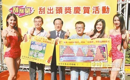 財神爺眷顧南台灣!高雄市三民區「正興一路發彩券行」及新興區「八八彩券行」,日前先後刮出「大麻將」頭獎1000萬元及「大富翁」頭獎500萬元;台灣彩券公司總經理黃志宜23日到高雄,向兩家彩券行老闆道賀,並分送200份刮刮樂給現場彩迷,有民眾當場刮中,趁機買彩券沾好運,希望能中大獎。