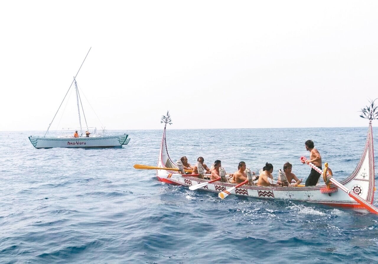 他們停留2天1夜後,昨天再度揚帆航向目的地關島。蘭嶼達悟族人特別以傳統10人拼板舟,護送Camacho離開,祝福他一路平安。