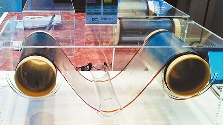 工研院研發的「一百微米超薄可撓玻璃連續捲軸式製程技術」,是全球首次以一百微米超薄可撓玻璃為基板,開發的超薄玻璃觸控模組製程。(陳育賢攝)