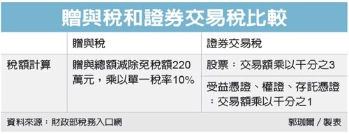 舉例來說,甲君得到每股價值20元的股票共12萬股,股票價值總計240萬元。若是一般的買賣行為,該筆股票金額就要適用於證券交易稅率千分之3,甲君須繳納7,200元的證券交易稅。但若為贈與行為,甲君則要就超出免稅額220萬元的部分(20萬元),採用現行贈與稅稅率10%,繳納贈與稅2萬元。