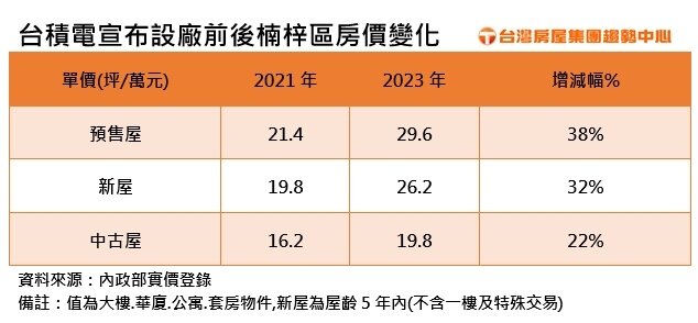 台灣房屋高雄品質促進會會長陳揚智表示,台積電效應確實為高雄房市刮起旋風,尤其楠梓區,從2021年下半年台積電拋出設廠話題後,短短1年多時間,就從原本的1字頭首購天堂快速翻漲,預售屋最高成交單價更飆破3字頭,部分個案成交價甚至比左營市區還高。