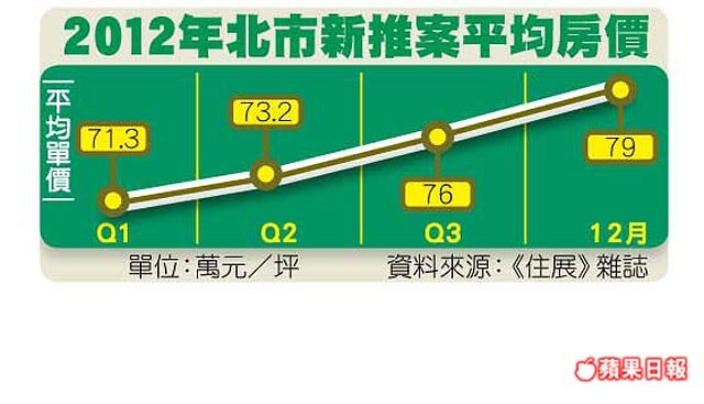 政府持續打房但尚未打到房價,據業者統計台北市12月新推案房價,以每坪79萬元再創新高,也較第1季漲10.7%。整體來看,大安區與信義區平均每坪126.3萬元仍為房價最高,而今年以來漲幅最多則為松山區,較第1季漲25.96%。