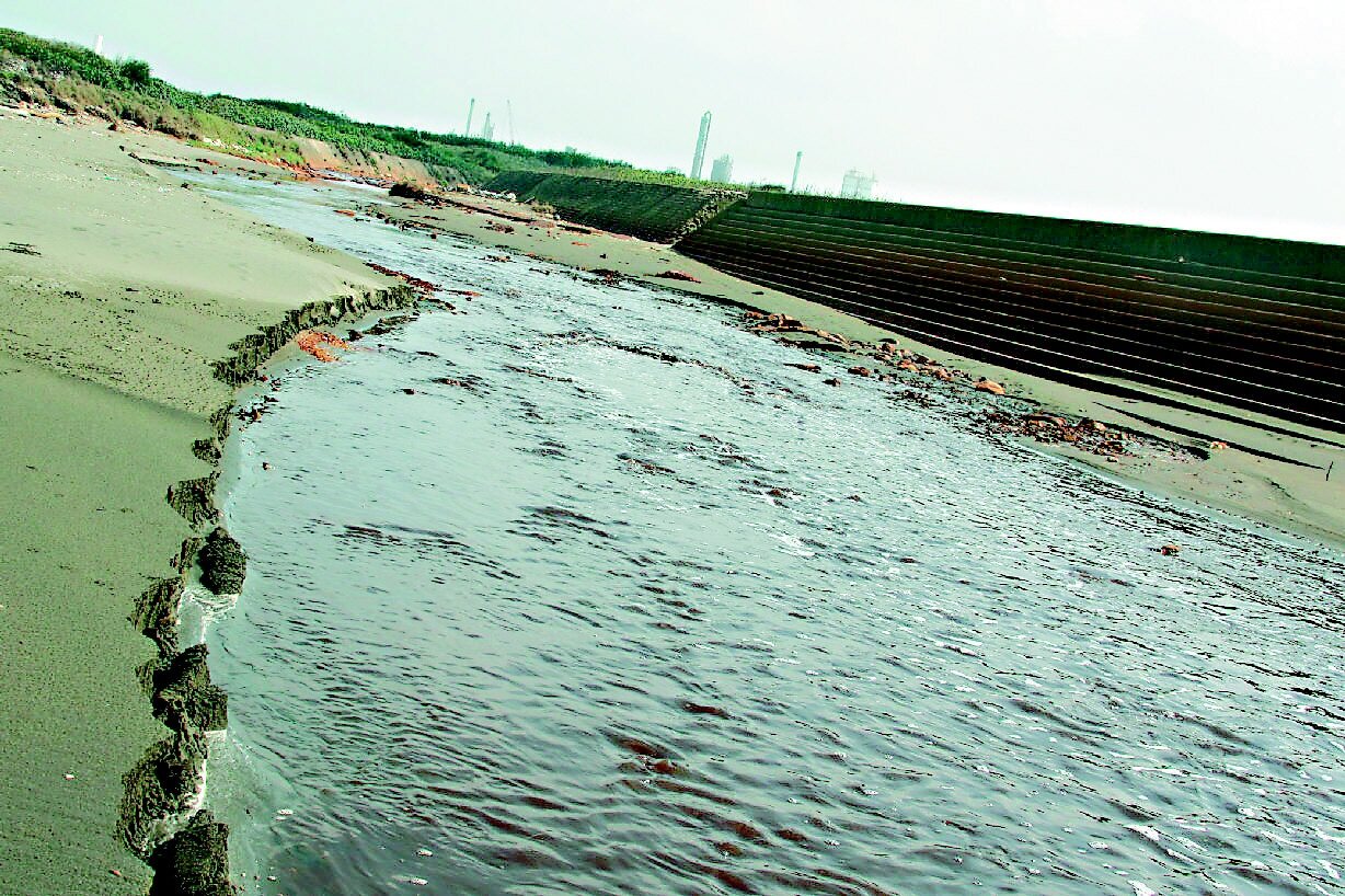 「看見台灣」拍下觀音工業區汙染河川,環保人士懷疑是觀音工業區汙水排放到樹林溪出海口的河川,昨拍攝出海口水質呈淡褐色。(記者曾增勳/攝影)