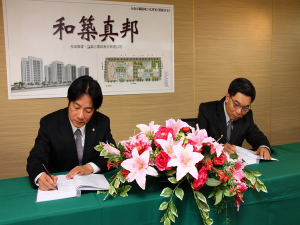 7日簽約儀式由賴清德市長及富立總經理陳聰徒共同簽署。賴市長非常感恩富立建設以在地最優品牌的作品回饋市民,也對陳總經理不計成本,不論獲利的公益之舉表達最高的敬意,期待透過富立的參與,為台灣重大公共建設史上打造嶄新的一頁。