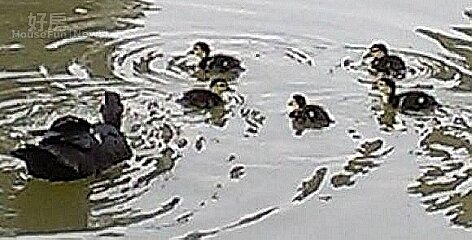 五隻黑小鴨跟著媽媽在湖中戲水,好不快活。