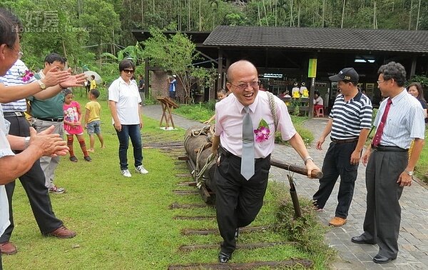 車埕『秘密花園』休閒行—尋找花、木、蘭活動,貴賓一起體驗用木馬拖運木材,水里農會理事長蕭志全成功拉動巨木,獲得在場來賓齊聲叫好回應。(記者吳素珍攝)