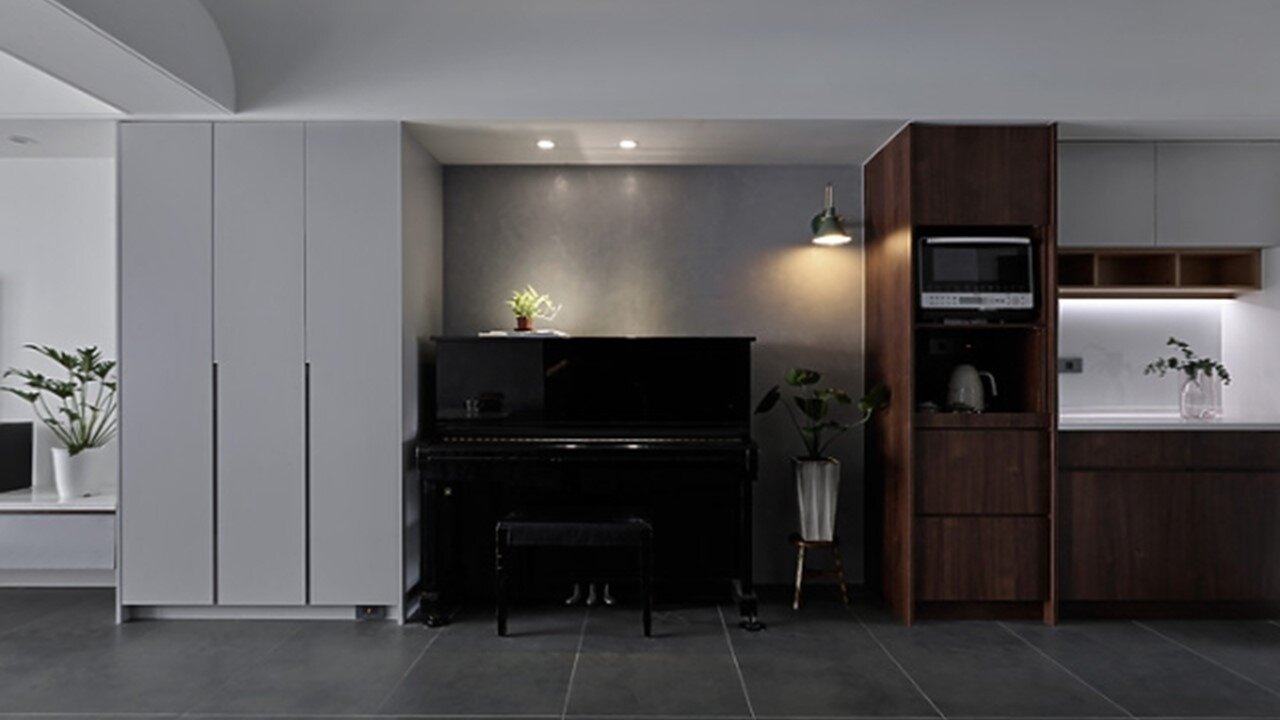 客戶指出,原有的鋼琴雖然比較少彈,但是丟掉又可惜,於是就請設計師規劃進去,在不影響動線下擺在收納櫃與電器櫃之間真的在適合不過了。