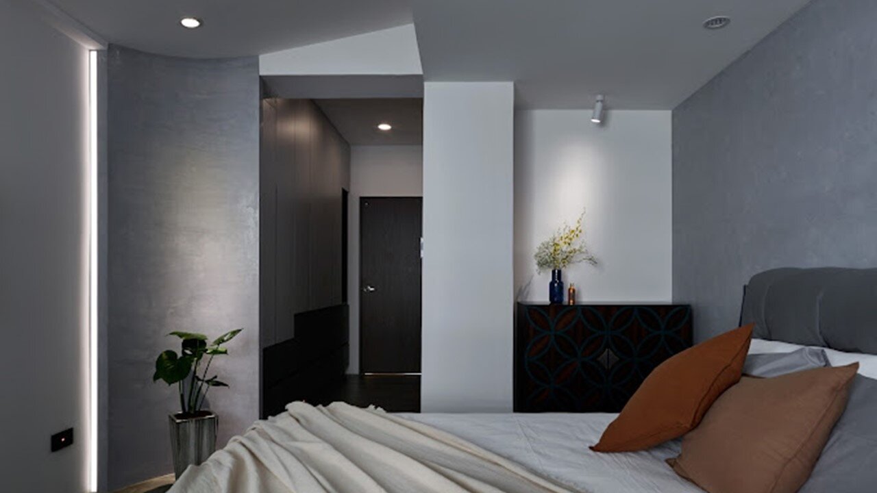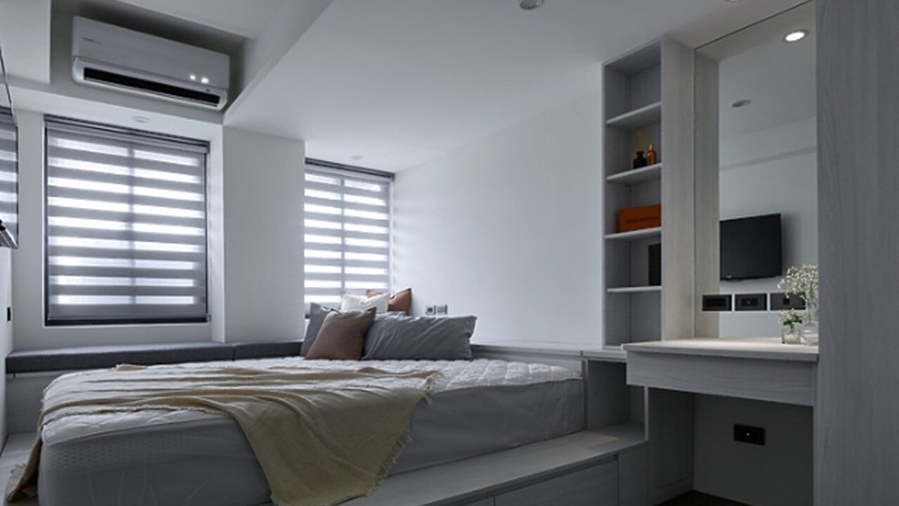客戶希望主臥室有飯店的感覺,可以同時有書桌也有較放鬆的臥榻區,經過多次討論終於定案了設計師提議將過去使用的木地板保留設計成主臥房靠窗面的樑下框,再一次的保留過去這屋內建材的陪伴,拆除時特別交代師父的小心動作與木工在此處理最後再麻煩油漆上保護面漆,保留下的不是材料而是回憶。主臥還有一大問題就在於床配置上有一隻平行的大樑又低,於是做了斜面天花板,將樑整個遮住卻不壓迫裝修前衣櫃根本已經塞不下了,做了很多的斷捨離,也同時規劃了進門走道的收納衣櫃並做到頂。