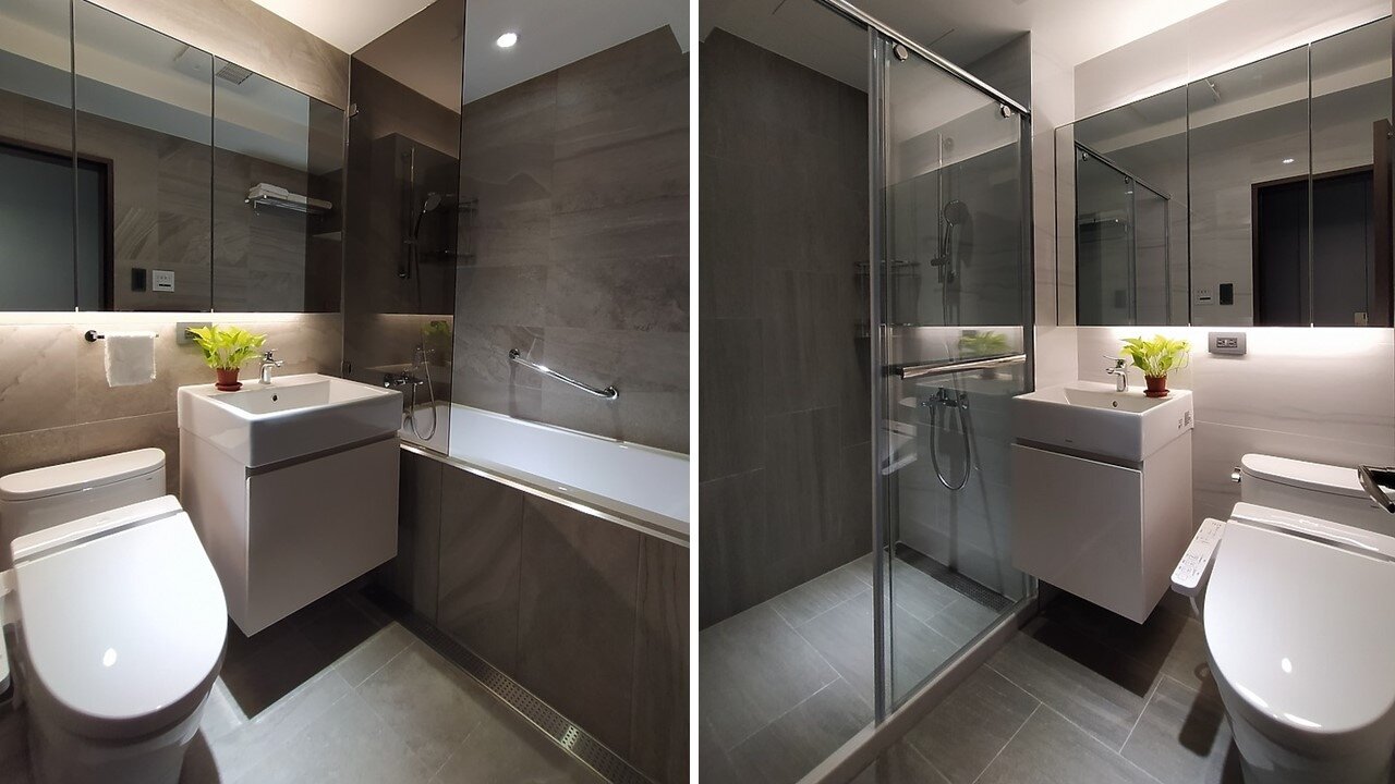 浴室的空間大約1坪,透過鏡面的延伸讓整個空間感更開闊,還增加收納機能防水也是很重要塗了三次以上加不織布,有的裝修公司防水塗到高度180而已,但是設計師他們很注重工程的細節,乾濕區防水都是塗到頂。