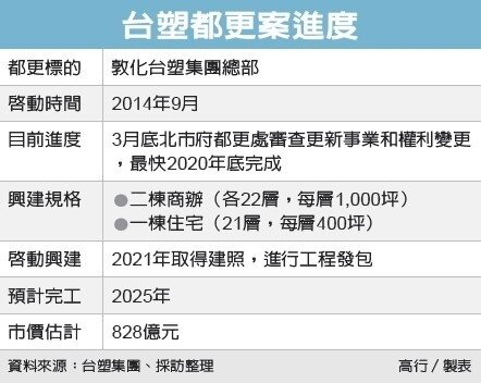台塑敦北總部都更案2014年啟動,2017年7月取得通過北市都更審議,取得都更啟動門票,今年2月下旬完成地主整合,獲得九成地主同意,3月底將更新事業計畫和權利變更計畫送入北市府都更處,進入實質審查的最後階段。