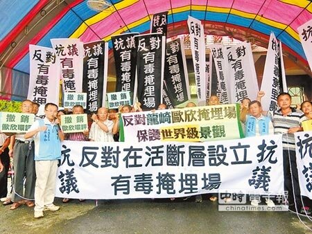 「歐欣事業廢棄物掩埋場」計畫落腳台南市龍崎牛埔,環保署長李應元2日到牛埔舉辦南區環保座談會時,支持與反對掩埋場的數百名鄉親壁壘分明,各自在場拉布條抗議。李應元接下雙方的陳情書,但未表態支持或反對興建掩埋場。