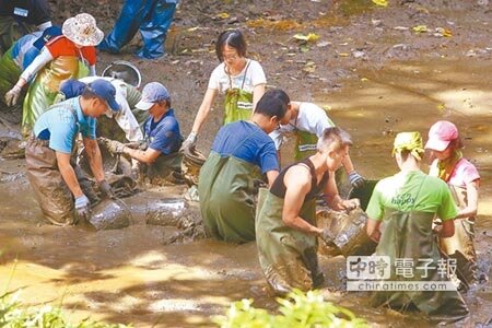 為復育木柵公園萃湖的螢火蟲,台北市工務局公園處和文山社區大學主辦的「找回萃湖美力」活動,昨上午開工,100名志工接力在放掉湖水的萃湖挖底泥裝袋,堆疊成土堤,保護魚、蝦、蟹、貝等原生物種,希望藉由生態環境的復原,打造適合螢火蟲的棲息地,預計最快後年復育成功。