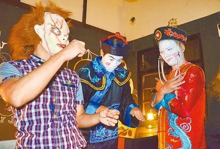插畫家小衰尾在民雄鬼屋旁辦趴,粉絲裝神弄鬼,扮成僵屍、鬼娃,群魔亂舞。(呂妍庭攝)