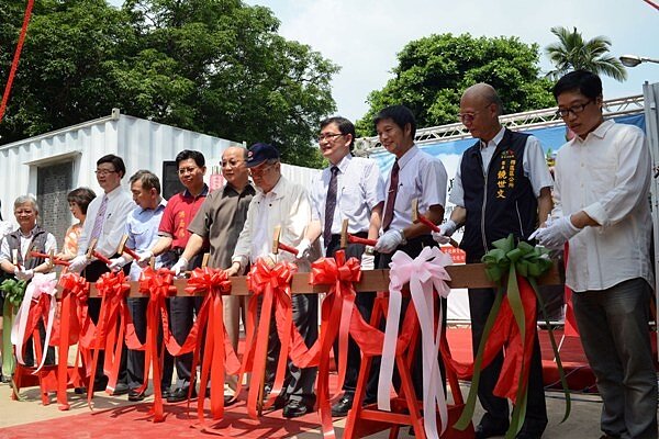 市長胡志強及文學家趙天儀等人敲下金槌後「台中文學館」正式開工