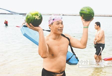 馬公市公所26日舉辦冬暖澎湖泳出健康活動,百名長泳好手頂著寒風冰水挑戰不可能任務,比賽輸贏不計較,趣味玩樂好過癮。馬公市長葉竹林下水同歡贏得大西瓜。