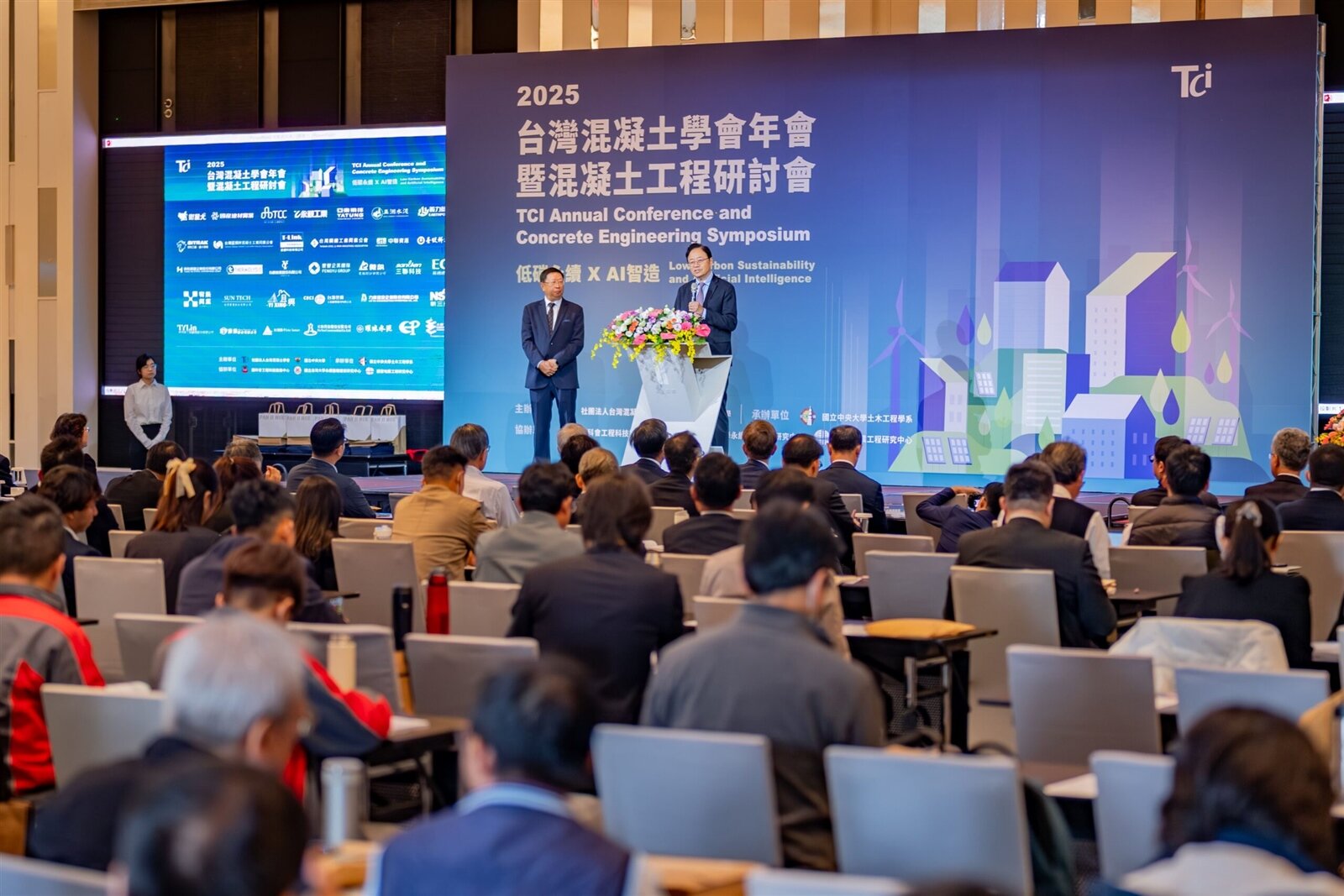 TCI台灣混凝土學會理事長金崇仁表示,今年技術年會以「低碳與智慧製造」為主題,涵蓋26大領域、超過150篇論文,展現台灣在永續材料與智慧化工程上的優異成果。TCI推動CNS標準更新,將混凝土試體由30×15公分改為20×10公分,提高試驗效率與安全性,並引進ACI國際規範,使技術與國際接軌。他指出,低碳材料已成全球趨勢,今年遴選的台大人文館與桃園機場跑道工程亦皆獲ACI國際肯定,顯示台灣混凝土技術的持續精進並逐步在國際舞台上站穩腳跟。