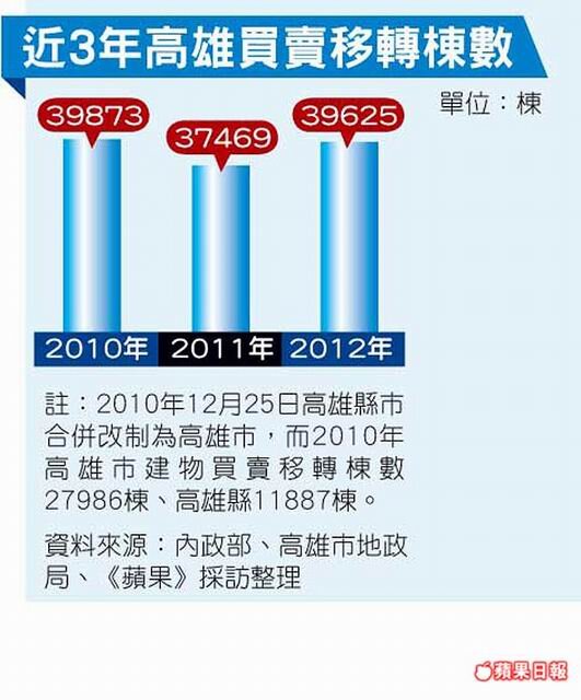 相較雙北去年全年建物買賣移轉棟數分別較前年減22.7%、17.62%,且創10年新低的慘況,高市2012年的交易量相對熱絡,甚至有7個月的交易量超過北市。