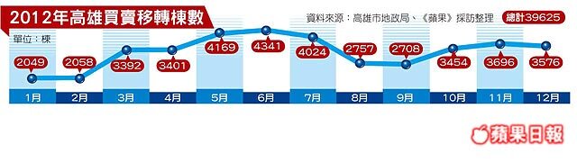 高市昨公布去年12月建物買賣移轉棟數為3576棟,雖比11月減少3.25%,但全年建物買賣移轉棟數共3.96萬棟,比2011年的3.74萬棟成長5.75%,創高市2010年升格以來新高。