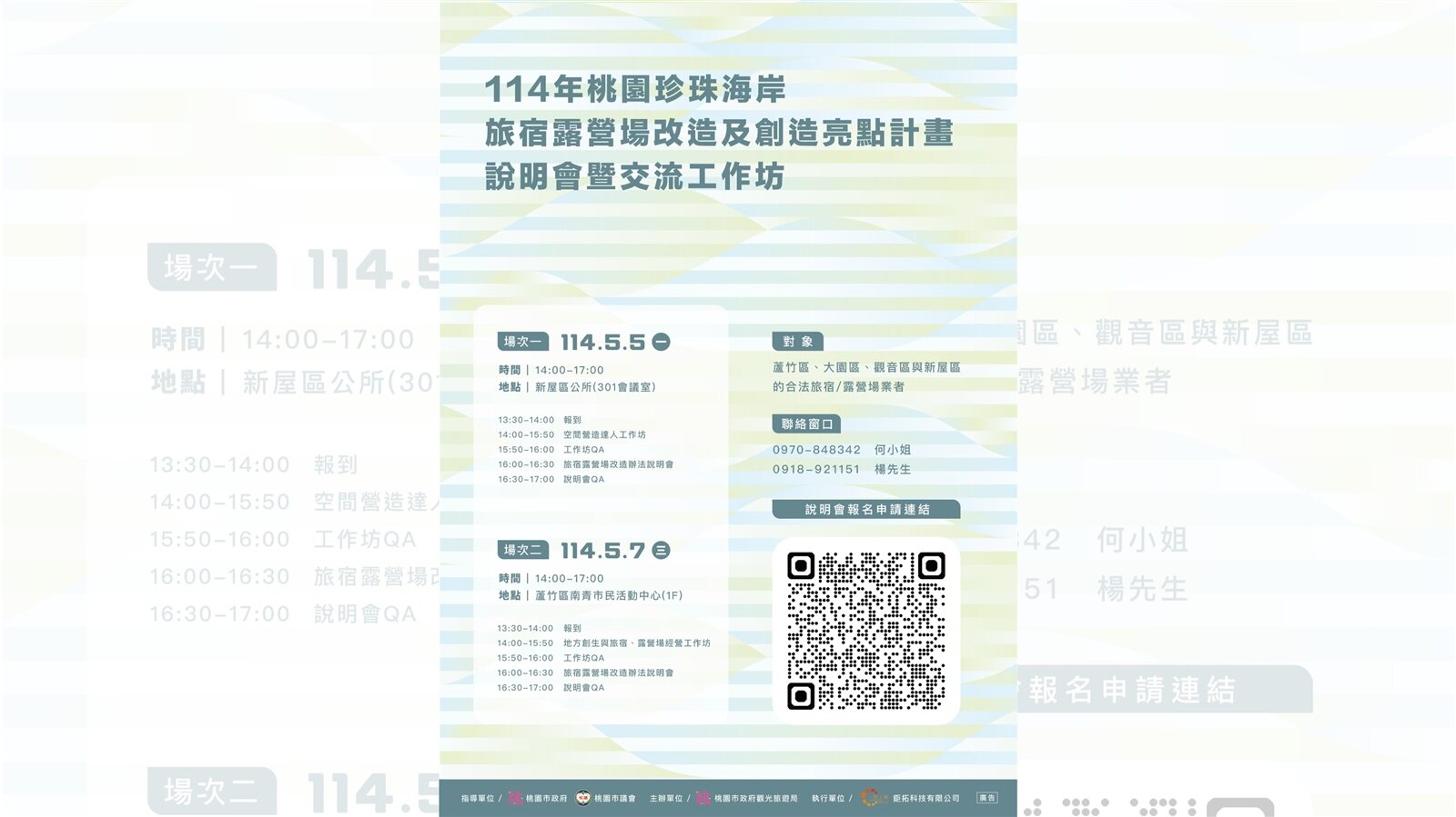 桃園海岸線全長46公里,擁有草漯沙丘、觀新石滬、許厝港濕地等自然與豐富的海岸風情,同時蘊含深厚在地文化與歷史資產,如:牽罟捕魚、百年石滬及客庄海洋聚落等。桃園市政府配合交通部觀光署重要廊帶亮點營造計畫,推出114年桃園珍珠海岸旅宿露營場改造及創造亮點計畫,於5月5日及7日辦理計畫說明會暨交流工作坊,優先邀請蘆竹區、大園區、觀音區及新屋區的合法旅宿與露營場業者踴躍參與遴選,期盼透過旅宿亮點改造計畫,發揮在地文化及資源特色、營造空間創新及永續理念,提升整體服務品質與觀光吸引力,攜手打造具特色與永續性的桃園海岸旅宿新體驗。