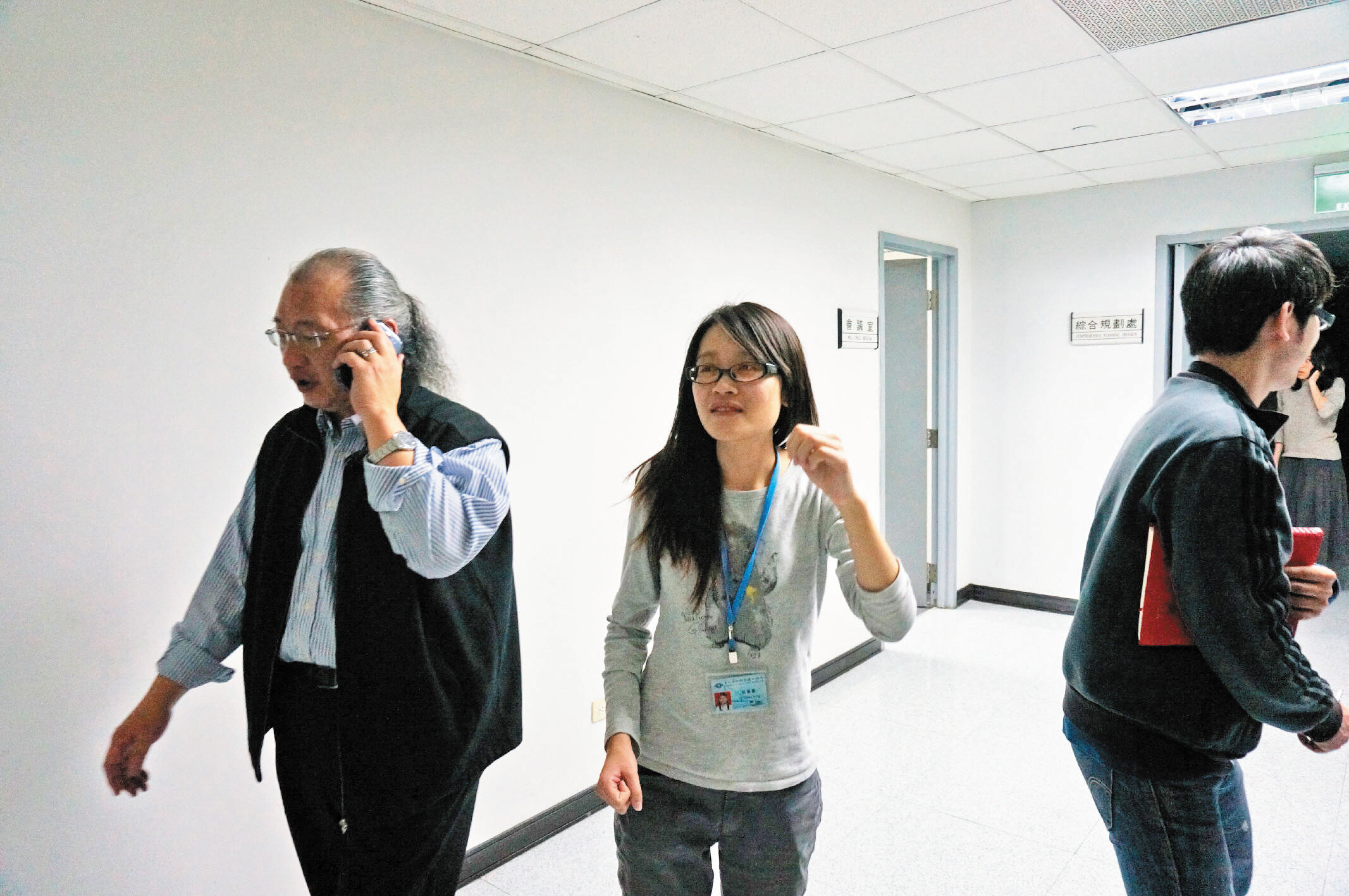 太極雙星協調人兼發言人王佑仁(左)等人,直到深夜都還在台北捷運局辦公室開會。旁為捷運局員工。 (圖/高詩琴)
