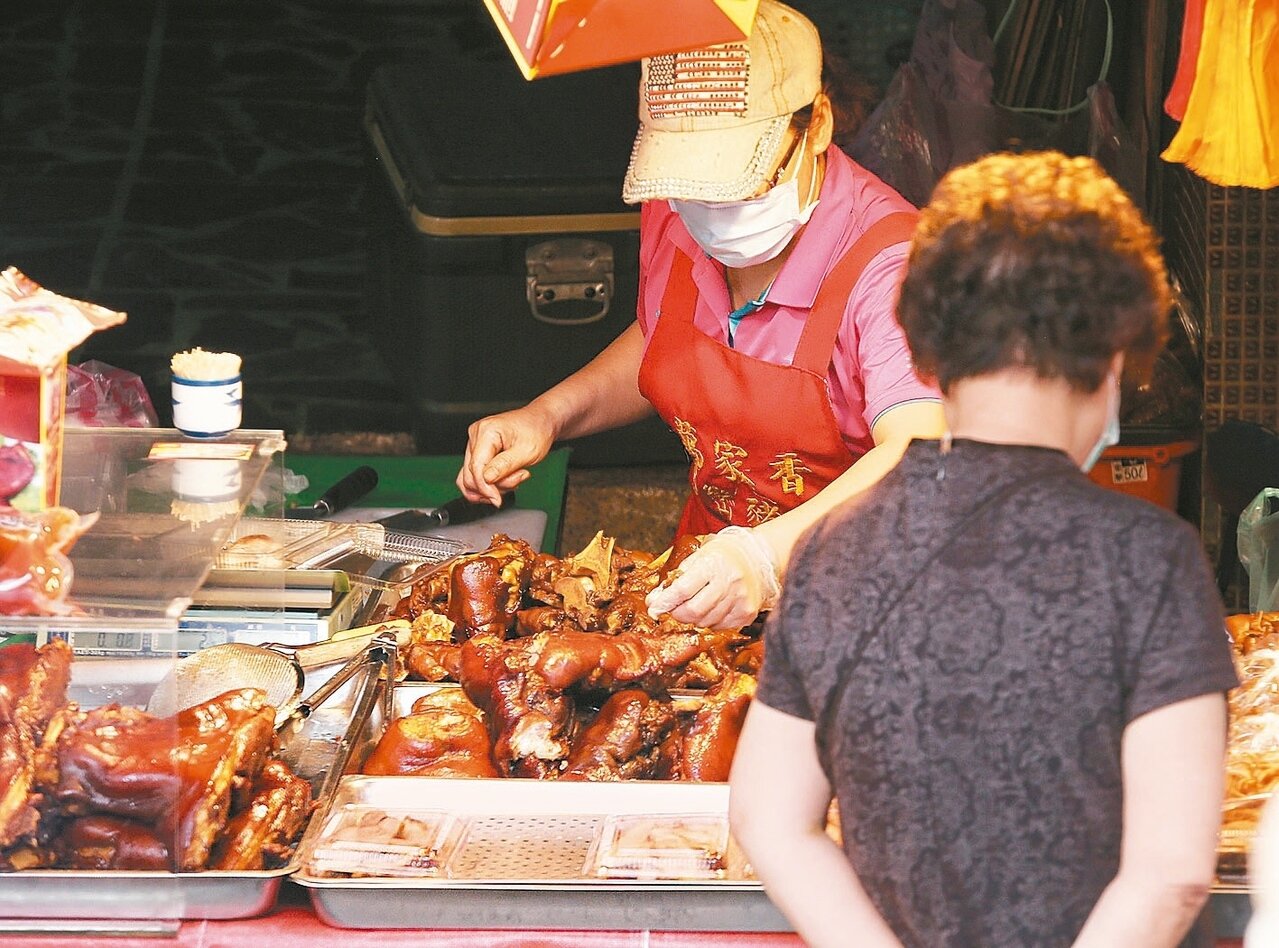 農委會表示,台灣未來六個月內豬肉、雞肉、雞蛋供貨正常,庫存充足,圖為販賣豬腳攤商。 記者曾原信/攝影