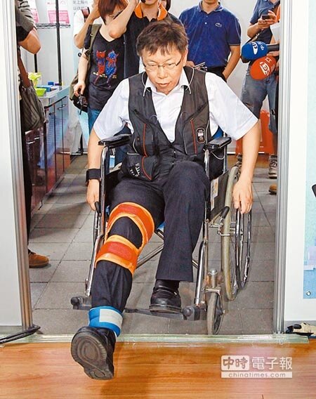 無黨籍台北市長參選人柯文哲20日出席伊甸基金會舉辦的無障礙生活節活動,坐著輪椅進廚房煮湯、洗碗,直呼不方便,好像參加軍中益智比賽。(截取自中時電子報)