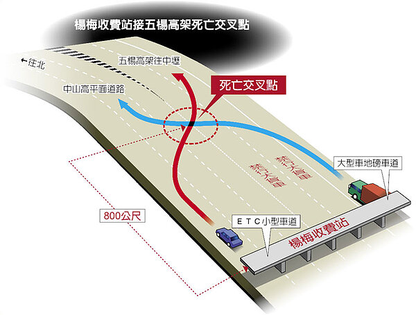 國道一號五股楊梅拓寬工程中壢到楊梅段本月十六日才通車,但許多車主反映,中山高北上過了楊梅收費站,大貨車需往內側車道繼續行駛國道一號平面段,要改走五楊高架的小客車則必須靠外側行駛銜接五楊高架,約八百公尺的交錯距離,成為小客車駕駛人膽顫心驚的「死亡交叉」路段。