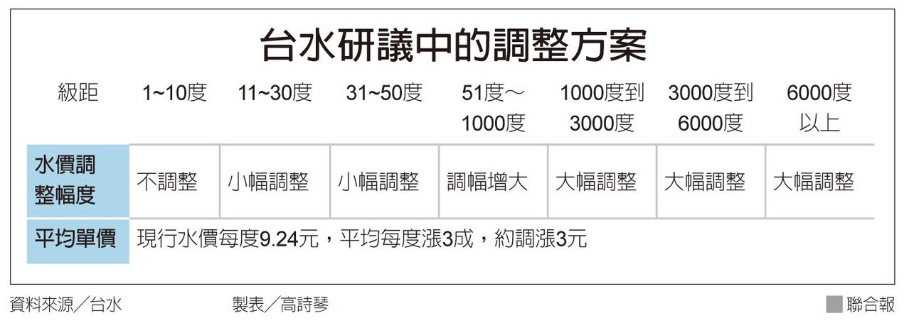 雖然郭俊銘並未指出水價調漲的「地板」是多少,但台水先前提出的水價調整方案曾建議平均漲幅約三成,平均水價從現有的九點廿四元平均調漲三元;推估未來水價漲幅應介於三成至六成之間。台水也研議把目前四個級距擴增到七到十個級距。