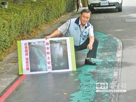 楊正中接到李姓市民投訴,昨日特前往事故現場了解,發現綠色路面刨除工作確實含糊籠統,多處路面都還留有刨除的殘跡,比一旁黑色柏油路面來得平滑。若碰到下雨,路面更溼滑,將對機車騎士構成致命的威脅。