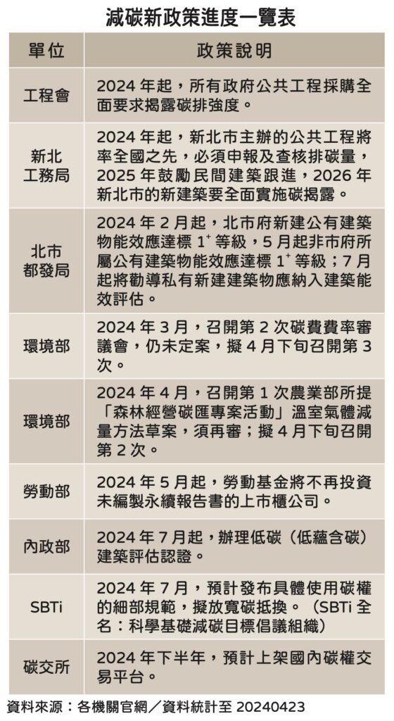 營建業被各國視作碳排大戶,占整體碳排放四成之多,根據《住展雜誌》訪查,即便政府官宣稱營建業不在首波開徵碳費之列,但行業人士內心都相當清楚,減碳一事最終將從原物料延伸到各行各業,因此建築產業很快就會受到來自供應鏈的衝擊。