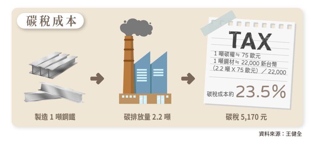 「詭譎多變」四個字,是中華經濟研究院副院長王健全為當前景氣所下的註解,其中關鍵便在於歐盟啟動碳邊境調整機制(CBAM),未來,台灣碳密集產品若未如實申報,七月起將面臨每噸碳排放量高達五十歐元的罰款,屆時恐連動影響國內生產成本;王健全以鋼鐵為例,估算碳稅成本約占23.5%(見圖),影響不容小覷。