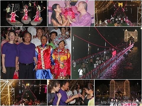 為期5天的「2013宜蘭情人節」活動,13日在冬山河浪漫登場。晚上7點7分一到,全長125公尺的鵲橋在夜色中驟然亮起,久候多時的民眾驚呼連連。縣長林聰賢和夫人林素雲,陪著林金發和林陳含笑老夫婦,引領眾人緩緩過橋,並且發送「點滴摯愛」紀念品,祝天下有情人都成眷屬,幸福到永久。