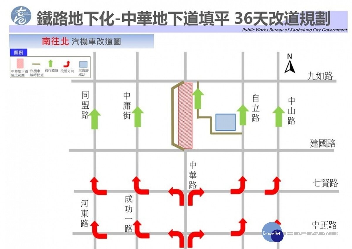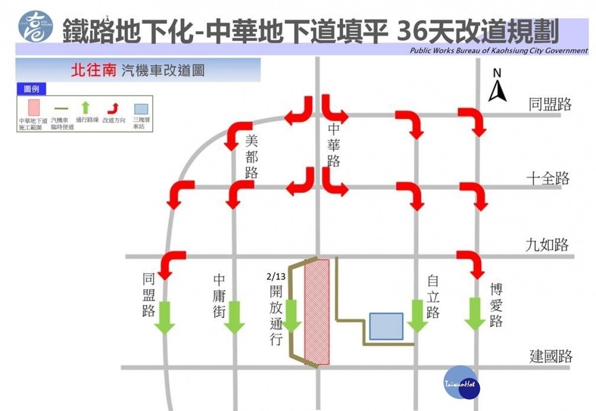 高雄市中華地下道自2月1日正式封閉進行填平及拆除作業,於2月13日開放南下臨時便道供汽機車通行,以降低封閉期間對用路人之不便。